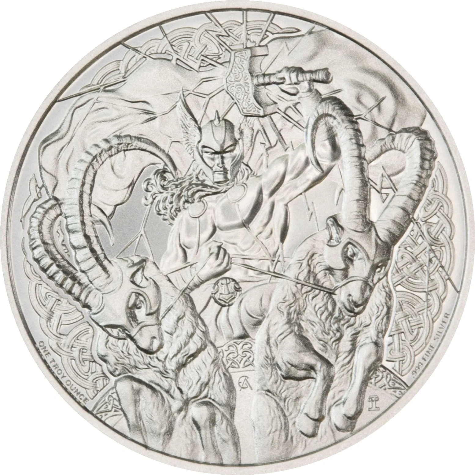 Thor riding his chariot, hammer in hand.