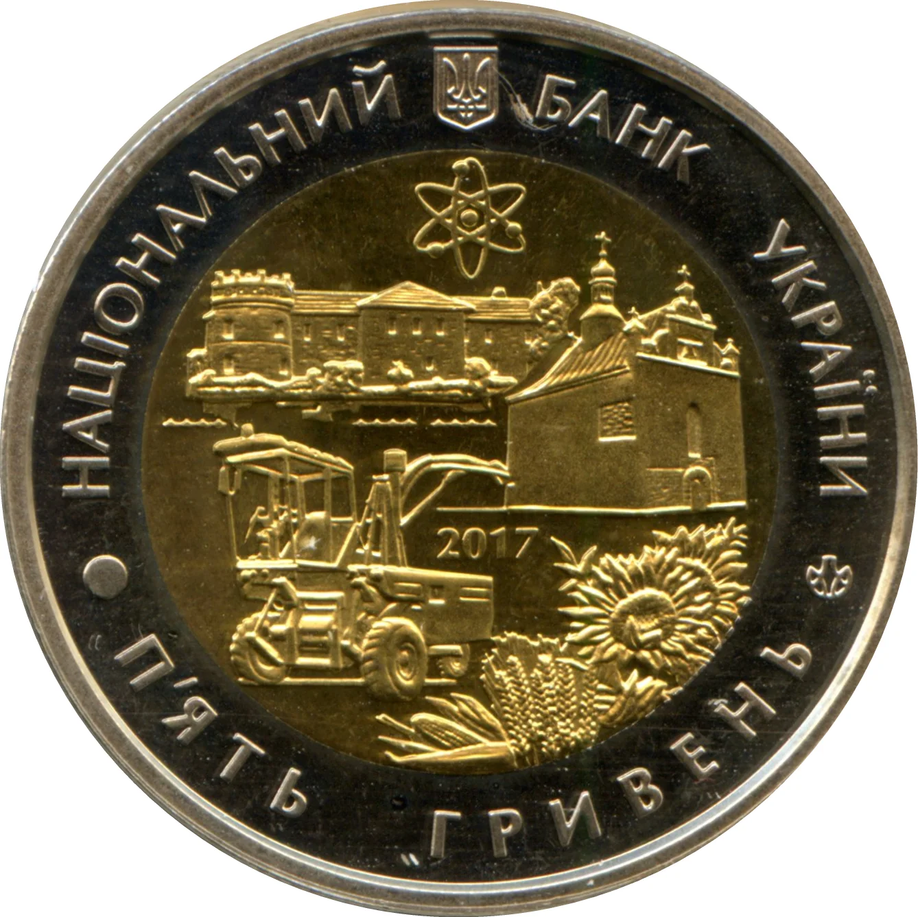 Description: The coin features Ukraine's small coat of arms. Circular inscriptions read "National Bank of Ukraine" and "Five Hryvnias." It includes the mint mark, issue year 2017, and a central composition symbolizing the oblast: the atom for peace symbol above Starokostiantyniv Castle, with Medzhybizh's St. Nicolas Church, an agricultural bouquet, and a harvester.