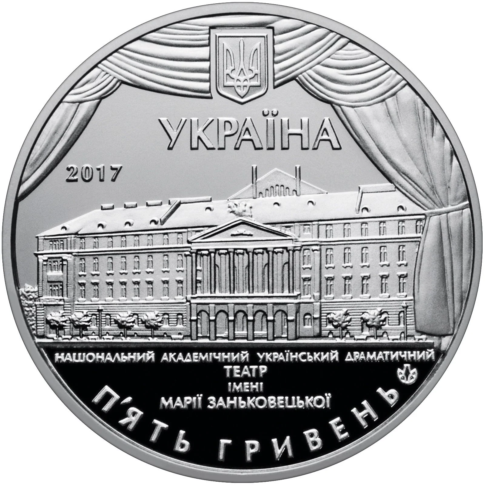 Description: Against a wing-textured background is Ukraine's small coat of arms, with УКРАЇНА and 2017 to its left. Centered is the theater's building, above the inscription: НАЦІОНАЛЬНИЙ АКАДЕМІЧНИЙ УКРАЇНСЬКИЙ ДРАМАТИЧНИЙ ТЕАТР ІМЕНІ МАРІЇ ЗАНЬКОВЕЦЬКОЇ. Below is the face value П'ЯТЬ ГРИВЕНЬ, with the NBU mint mark to the left.