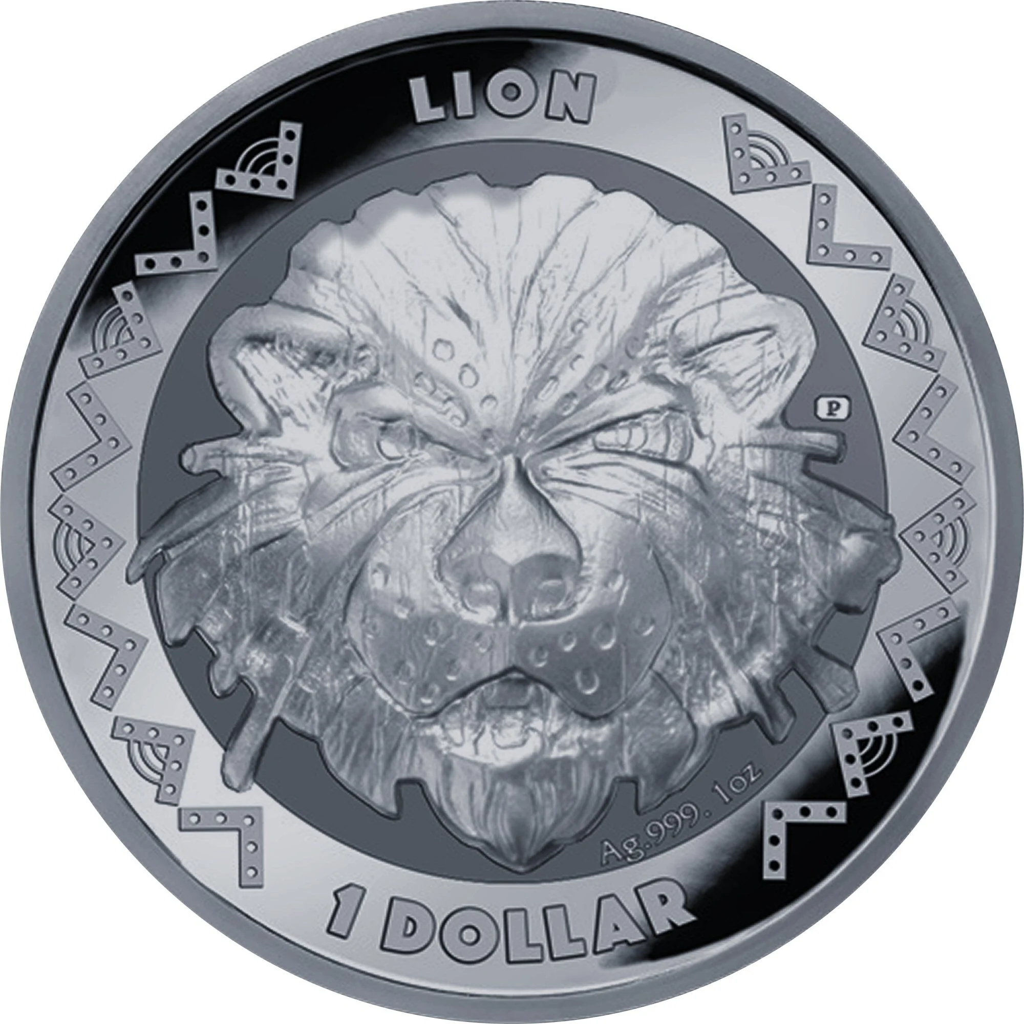Stylized lion head in an African mask style. Incused rim with African pattern. "Lion" above, denomination below.