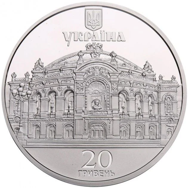 Ukraine's small coat of arms and the word УКРАЇНА are above the theater building, which is centered on a plain background. The denomination 20/ГРИВЕНЬ is below.