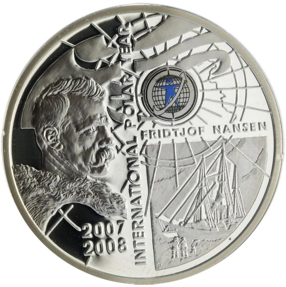 Fridtjof Nansen bust left, ship in ice lower right, multicolor emblem above.