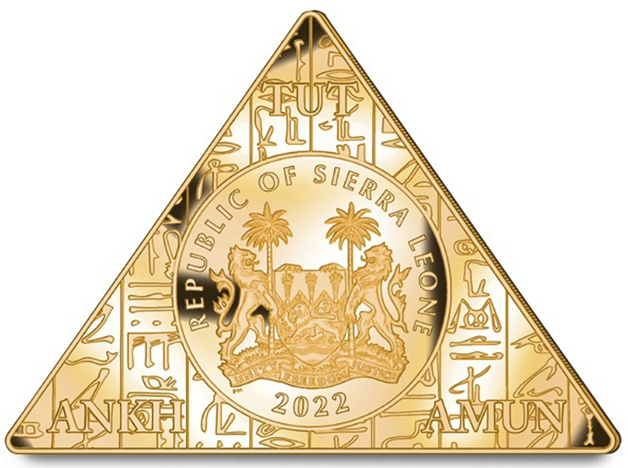 Sierra Leone's coat of arms encircled by hieroglyphs.