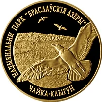 A herring gull in relief over a mirrored lake. Around the rim: above, "НАЦЫЯНАЛЬНЫ ПАРК 'БРАСЛАЎСКІЯ АЗЁРЫ'"; below, "ЧАЙКА КЛЫГУН".