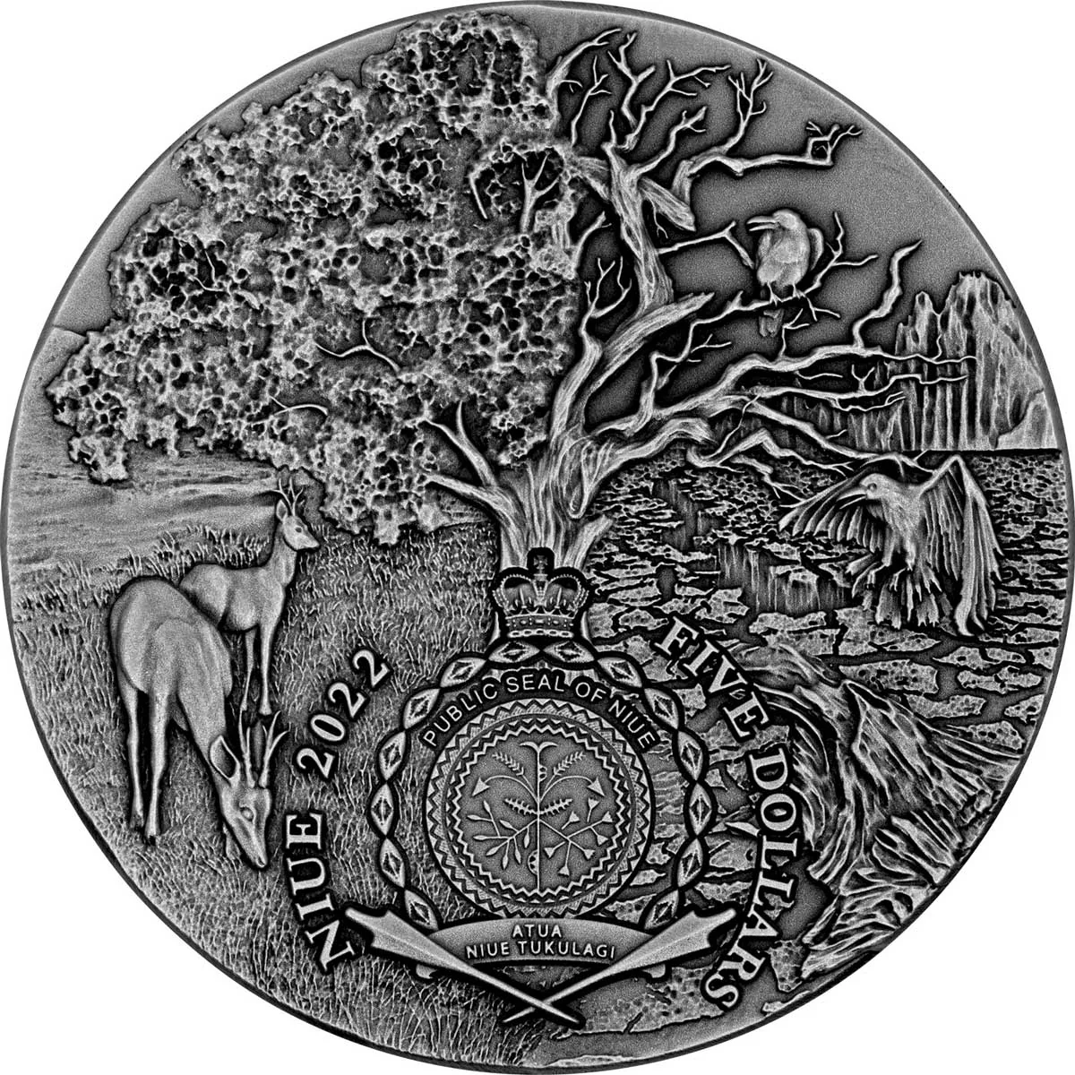 Description: A depiction of heaven and hell: a fertile landscape left, barren right. The Tree of Eden divides them, lush on the left, withered on the right. Below are the Public Seal of Niue, the year 2021, and the face value of 5 Dollars.