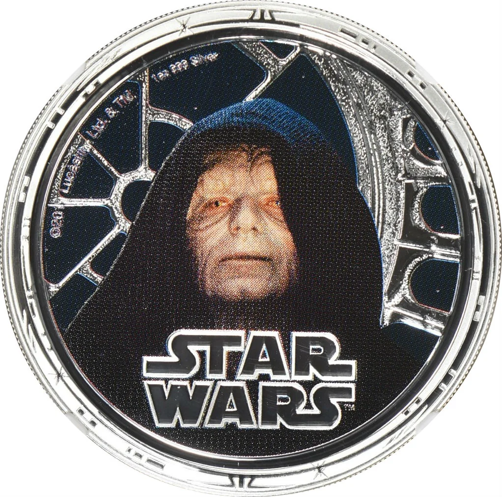 Colorized Emperor Palpatine facing forward with Star Wars logo.