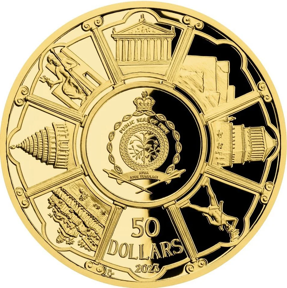 Niue's Public Seal encircled by the Seven Ancient Wonders.