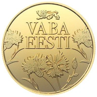 Heraldic lion over four Estonian national flowers (cornflowers).