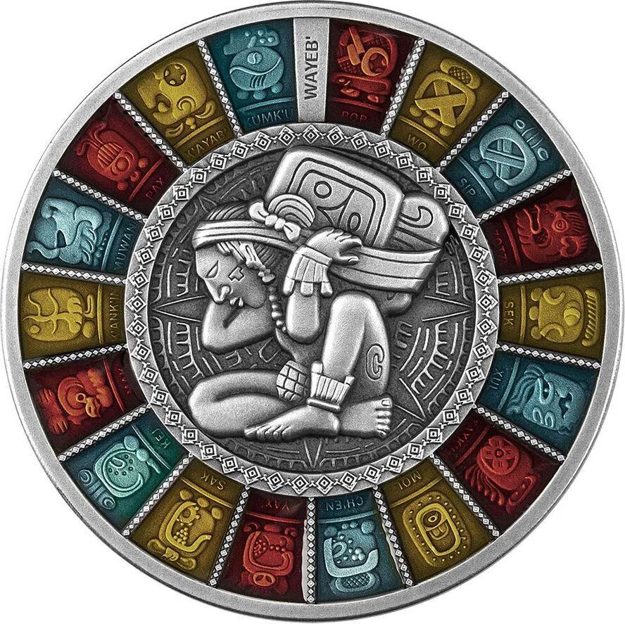 Description: A Mayan man bends under a heavy symbolic load, depicted in figurative style. Around him, 18 segments represent the Haab' calendar months, plus the 5-day Wayeb' period.