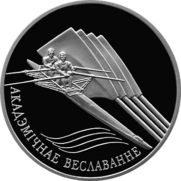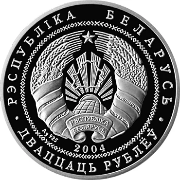 Description: The circular ornament features the relief of the State Coat of Arms. Below are the year and alloy standard. The rim inscriptions: "РЭСПУБЛIКА БЕЛАРУСЬ" (REPUBLIC OF BELARUS) above and "ДВАЦЦАЦЬ РУБЛЁЎ" (TWENTY ROUBLES) below.