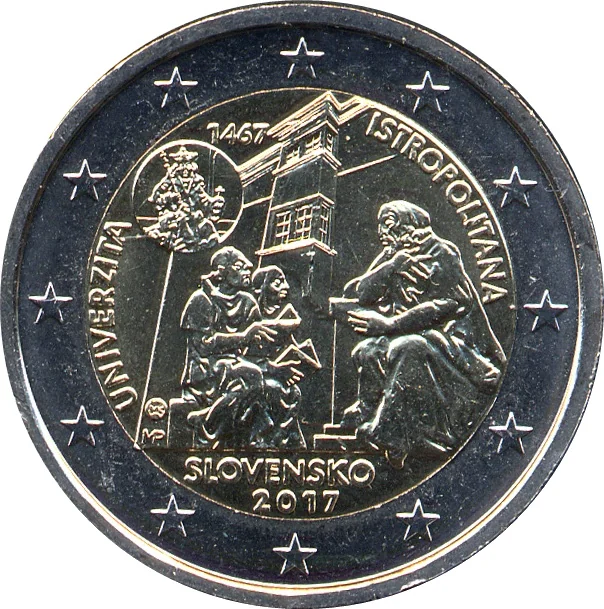 The design features a teacher and two students before the former Universitas Istropolitana in Bratislava. A medallion of founder King Matthias Corvinus and the year "1467" appear upper left. "UNIVERZITA" and "ISTROPOLITANA" flank the inner circle, with "SLOVENSKO" and "2017" at the base. The Kremnica Mint mark ("MK") and the designer's initials ("MP") are at lower left.