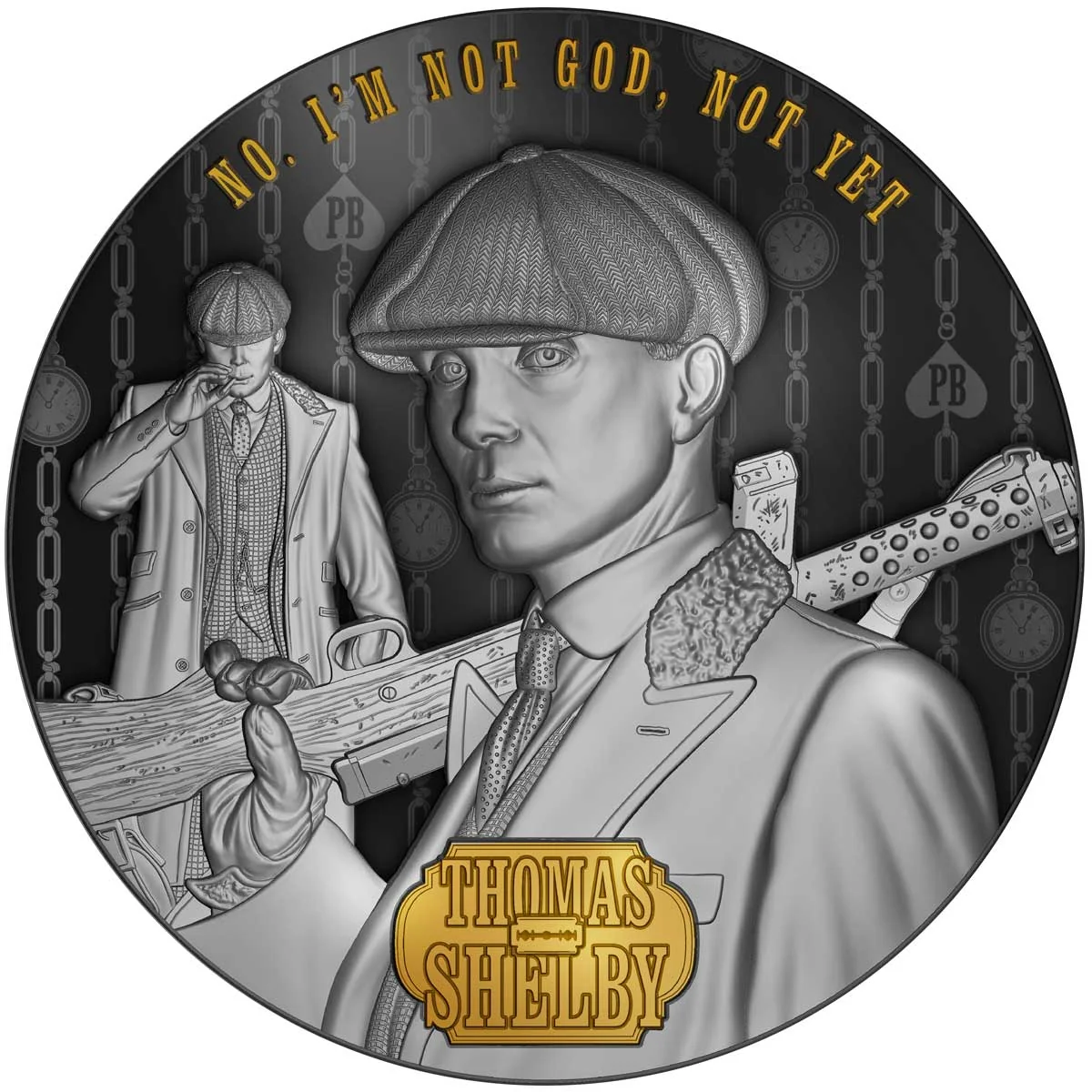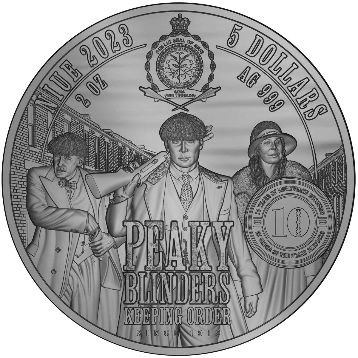 Description: Niue's Public Seal depicts Tommy, Arthur Shelby, and Aunt Polly armed, walking down a street flanked by terraced houses.