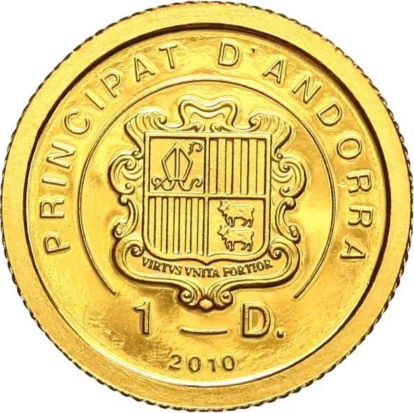 Andorran coat of arms featuring the motto "Virtus Unita Fortior" in a partial circle.