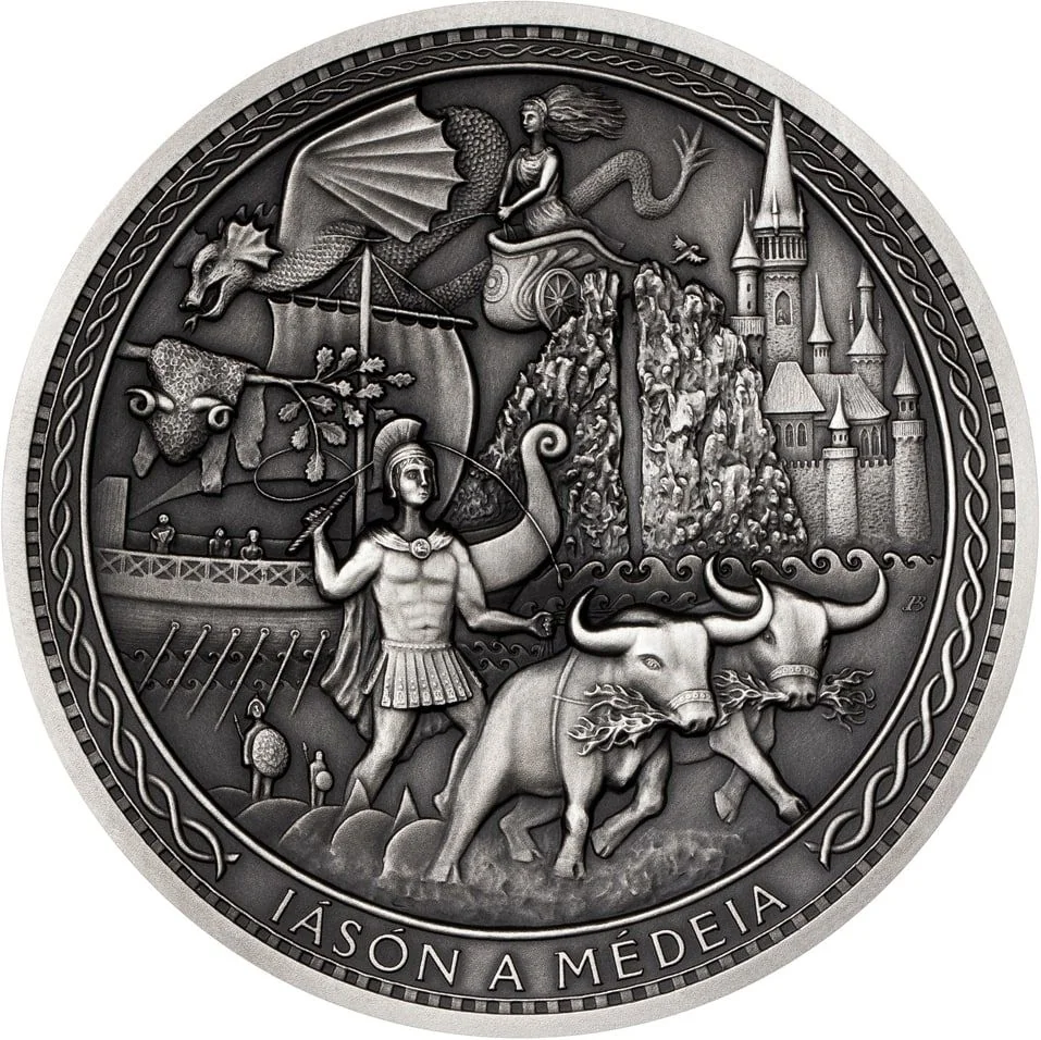 Jason’s quest for the golden fleece: the Argo, fiery bulls, a dragon, and Medeia’s aid.