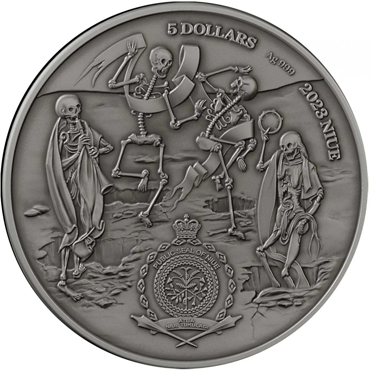 Niue's Public Seal: a macabre dance of death, showing all are equal before it.