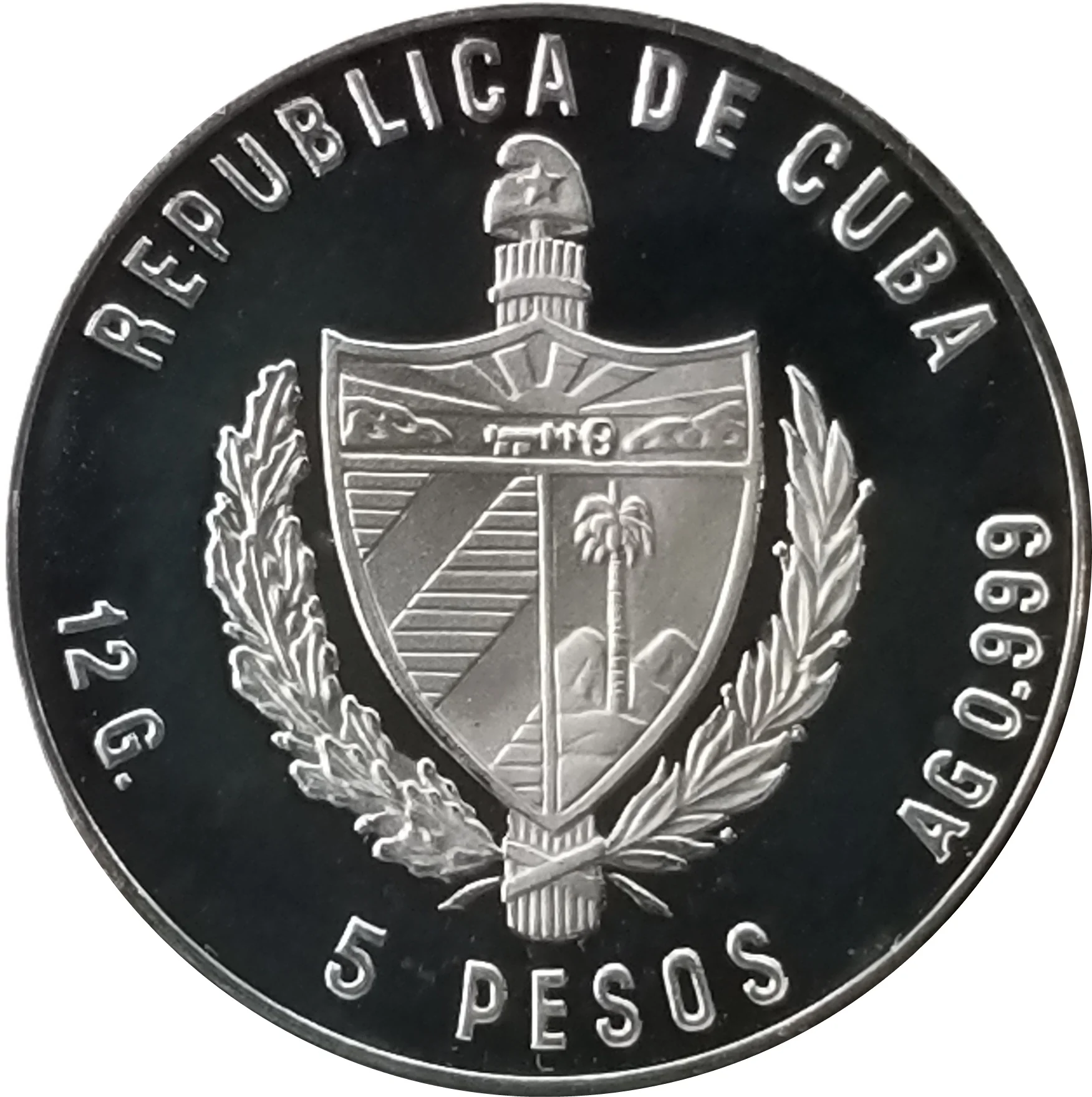 Cuban coat of arms with country name above, weight and fineness on the sides, and face value below.