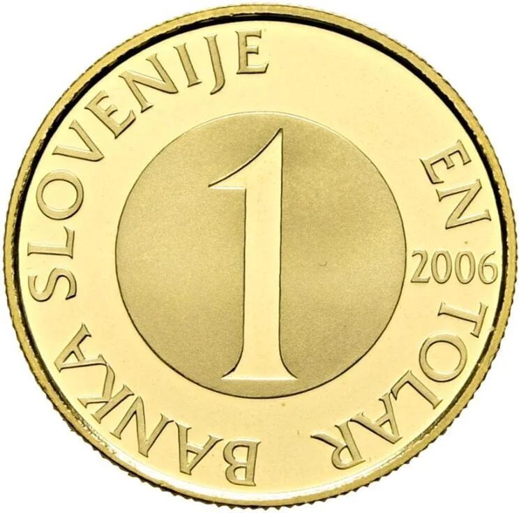 Embossed circle with a "1," left "BANKA SLOVENIJE," right "EN TOLAR" and the year.