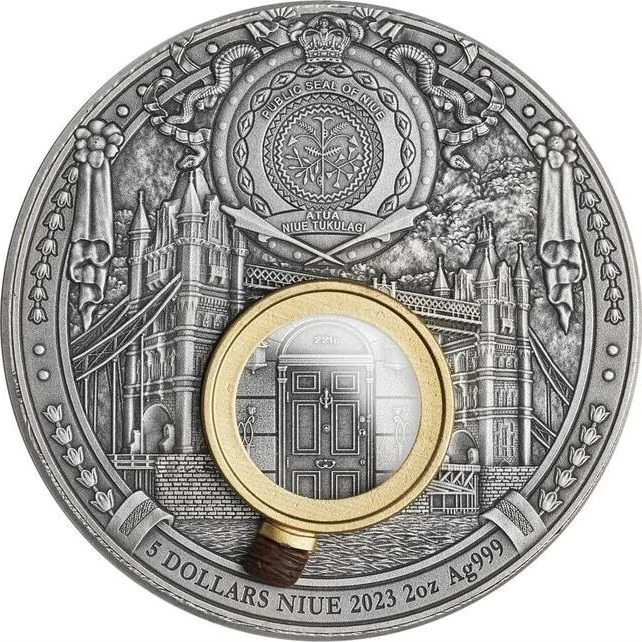 221B Baker Street door bearing Niue's Public Seal.