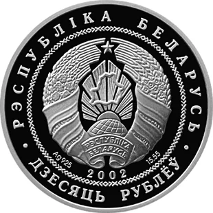 Description: The circular ornament features the relief of the State Coat of Arms. Below are the year, silver content, and alloy standard. The rim inscriptions: above, "РЭСПУБЛIКА БЕЛАРУСЬ"; below, "ДЗЕСЯЦЬ РУБЛЁЎ".