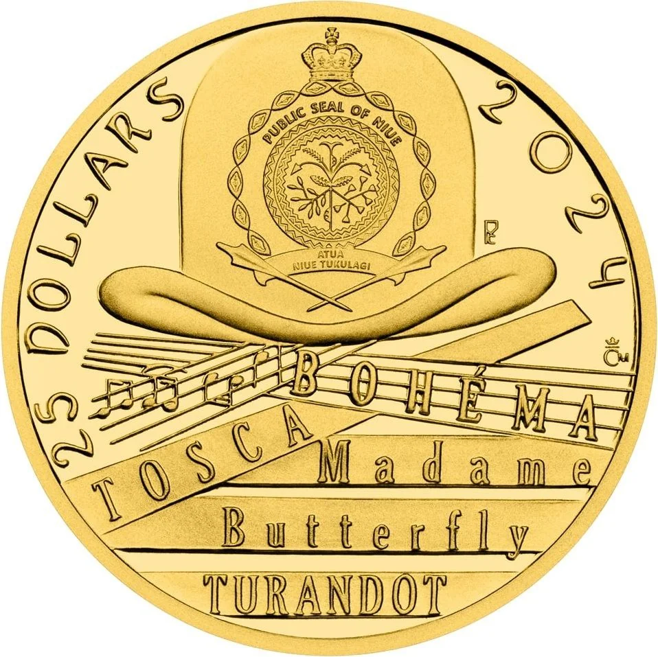 Puccini's hat and famous works in a coat of arms.