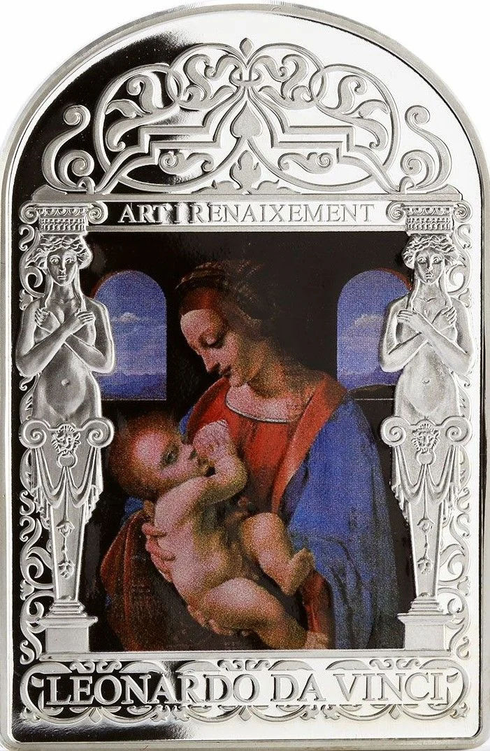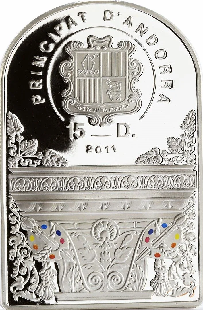 Andorran coat of arms on a capital, flanked by floral designs and painter's palettes.