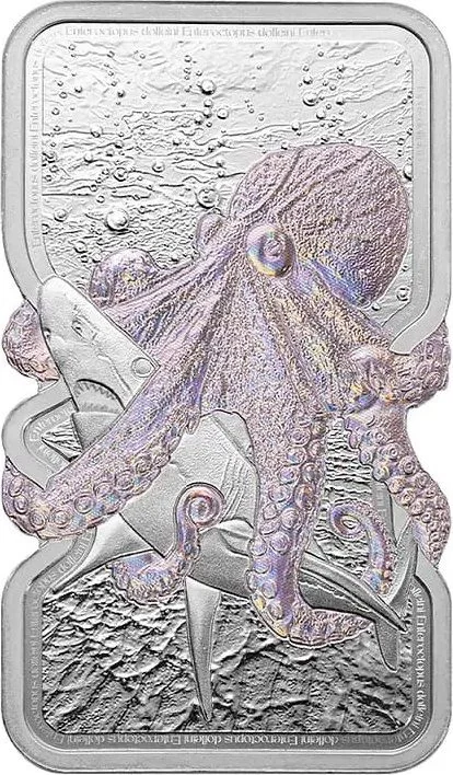 A Giant Pacific octopus constricting a shark, central to the coin.
