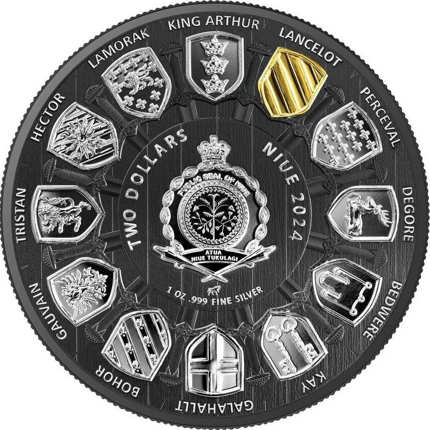 Twelve shields encircling a round table.
