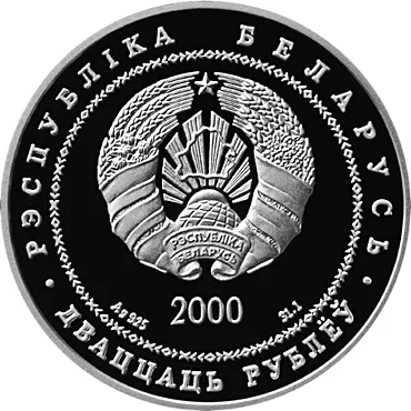 Description: The circular ornament features the relief of the State Coat of Arms. Below are the year, silver content, and alloy standard. The rim inscriptions: "РЭСПУБЛIКА БЕЛАРУСЬ" above and "ДВАЦЦАЦЬ РУБЛЁЎ" below.