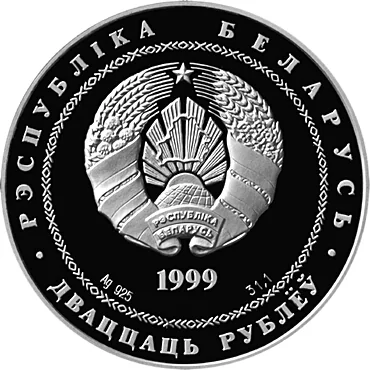Description: The circular ornament features the relief State Coat of Arms. Below are the year, silver content, and alloy standard. The rim inscriptions read: "РЭСПУБЛIКА БЕЛАРУСЬ" above and "ДВАЦЦАЦЬ РУБЛЁЎ" below.