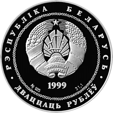 Description: The circular ornament features the relief of the State Coat of Arms. Below are the year, silver content, and alloy standard. The rim inscriptions: "РЭСПУБЛIКА БЕЛАРУСЬ" above and "ДВАЦЦАЦЬ РУБЛЁЎ" below.