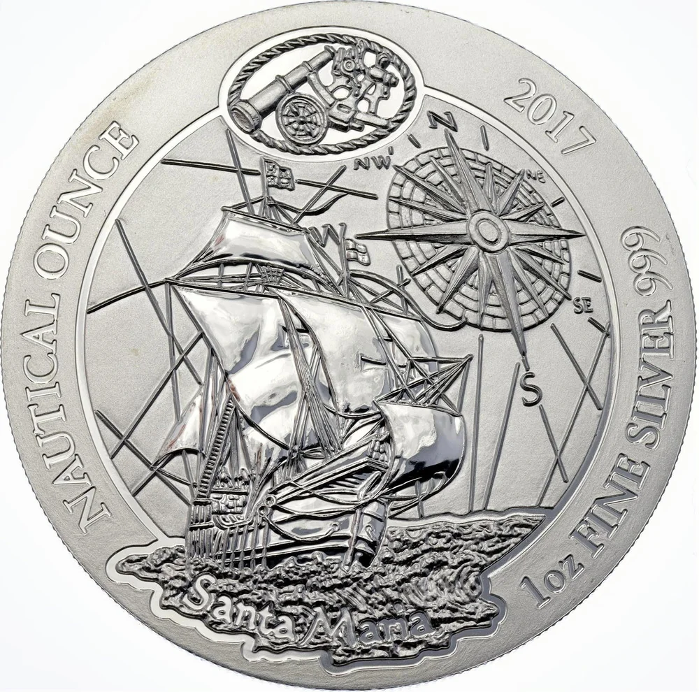 Santa Maria left, compass rose right, nautical instruments top centre.