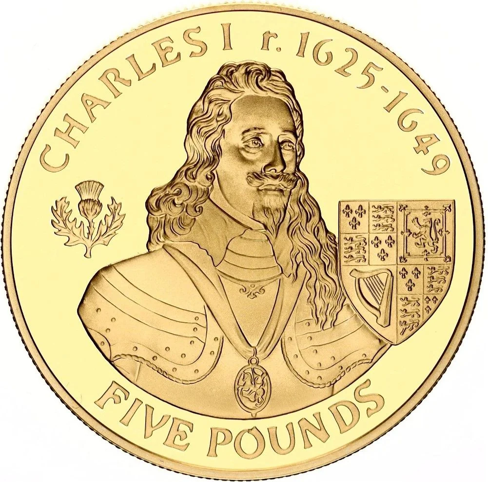 Portrait of Charles I with thistle left, shield right, dates above, denomination below.