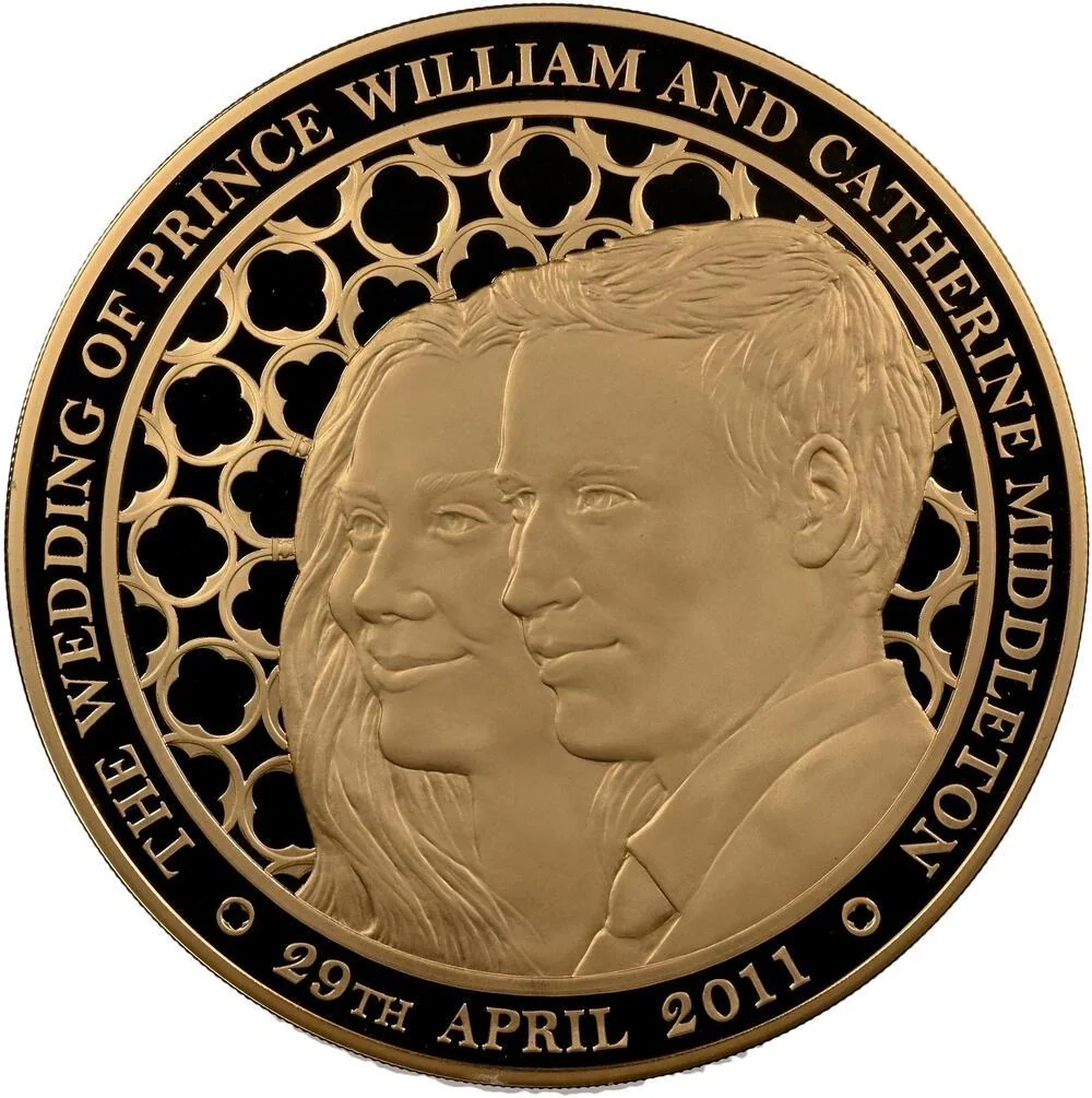 William and Kate's busts, Westminster Abbey's Rose window behind.