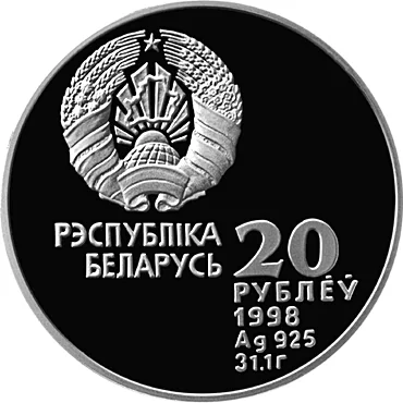Description: The obverse features the Belarusian coat of arms with "РЭСПУБЛIКА БЕЛАРУСЬ" above. The reverse shows the face value, issue year, weight, and alloy.