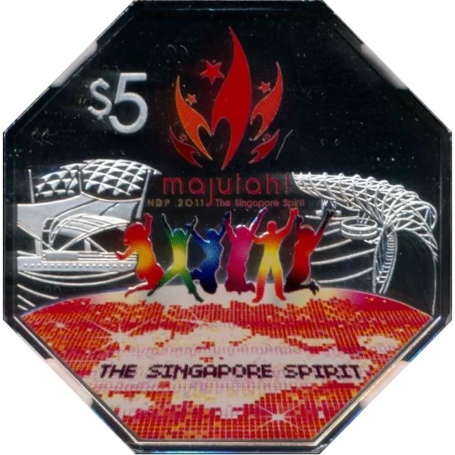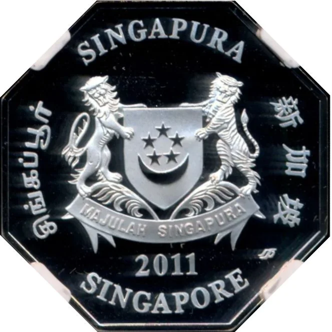 Emblem with date; 'Singapore' encircles it in English, Tamil, Chinese, and Malay.