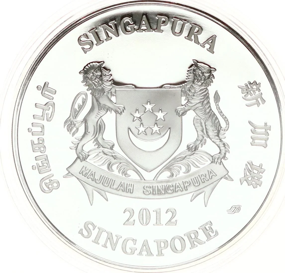 Emblem with date; 'Singapore' encircles it in English, Tamil, Chinese, and Malay.