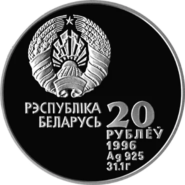 The obverse features the Belarusian coat of arms with "РЭСПУБЛIКА БЕЛАРУСЬ" above. The reverse shows the face value, issue year, weight, and alloy.