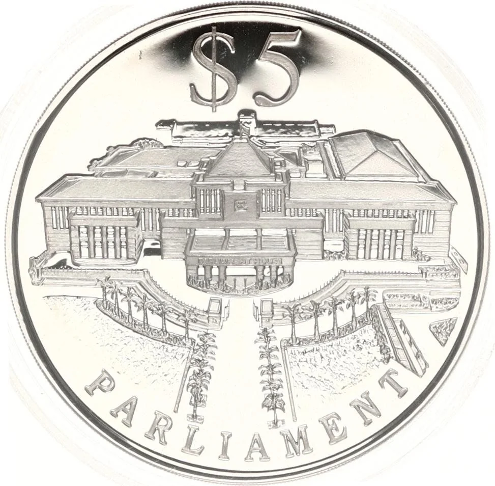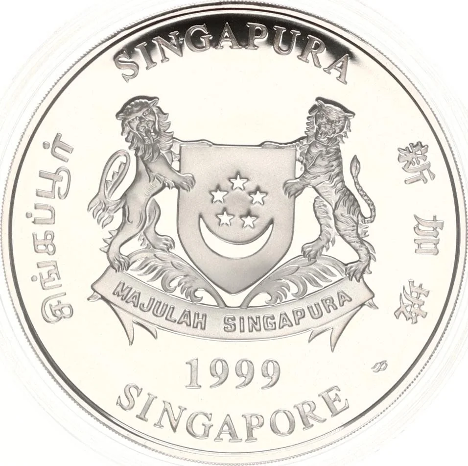 Emblem with date; 'Singapore' encircles it in English, Tamil, Chinese, and Malay.