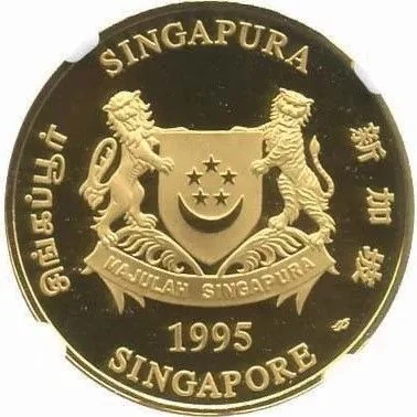 Emblem with date; 'Singapore' encircles it in English, Tamil, Chinese, and Malay.