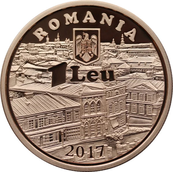 A 2017 one-leu coin featuring a vintage snapshot of Bucharest, an arched "ROMANIA" inscription, and Romania's coat of arms.