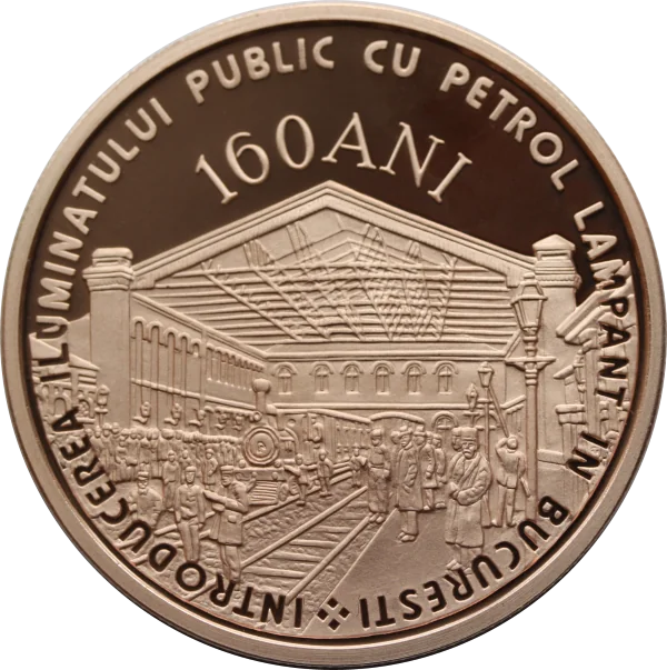 A vintage image of Filaret station, reading "INTRODUCEREA ILUMINATULUI PUBLIC CU PETROL LAMPANT IN BUCURESTI" and "160ANI".