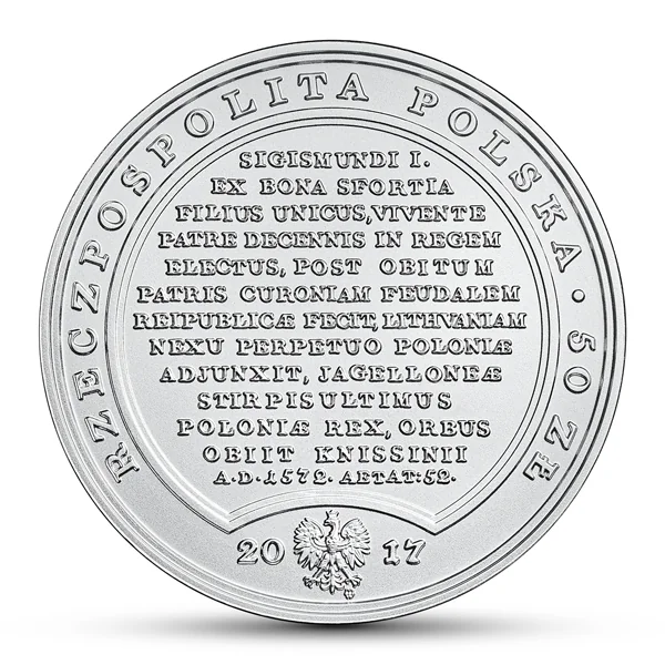 SIGISMUNDI I. EX BONA SFORTIA FILIUS UNICUS, VIVENTE PATRE DEGENNIS IN REGEM ELECTUS, POST OBITUM PATRIS CURONIAM FEUDALEM REIPUBLICAE FECIT, LITHVANIAM NEXU PERPETUO POLONIAE ADJUNXIT, JAGELLONES STIRPISULTIMUS POLONIAE REX, ORBUS OBIIT KNISSINII A·D·1572·AETAT:52·