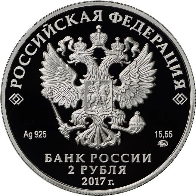 The obverse features the Russian Federation coat of arms with "РОССИЙСКАЯ ФЕДЕРАЦИЯ" above. Below are the metal specifications and mint mark. At the bottom, "БАНК РОССИИ", "2 РУБЛЯ", and "2017 г." are inscribed.