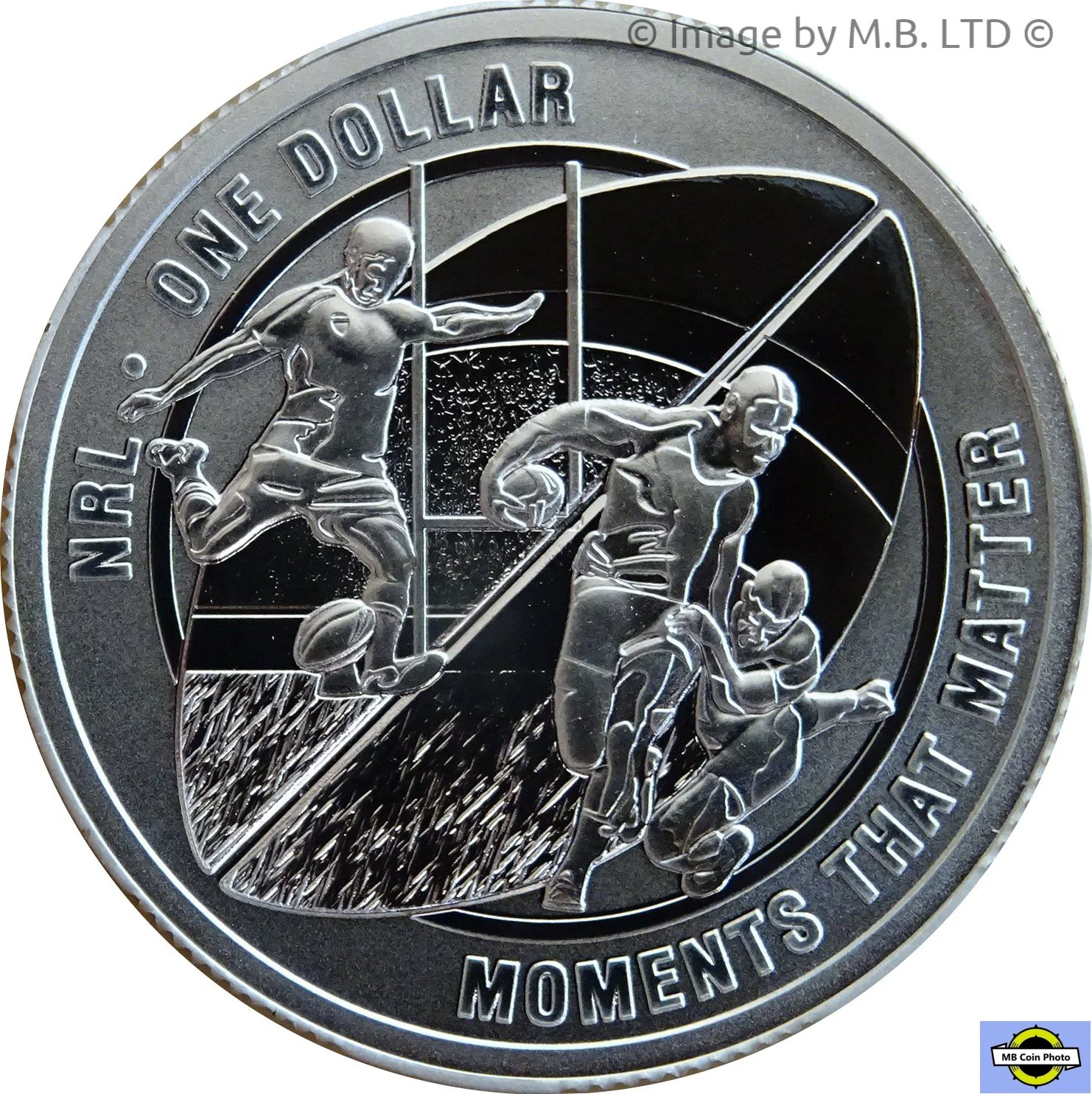 Rugby League players running and kicking before goalposts, set against a football-shaped background.