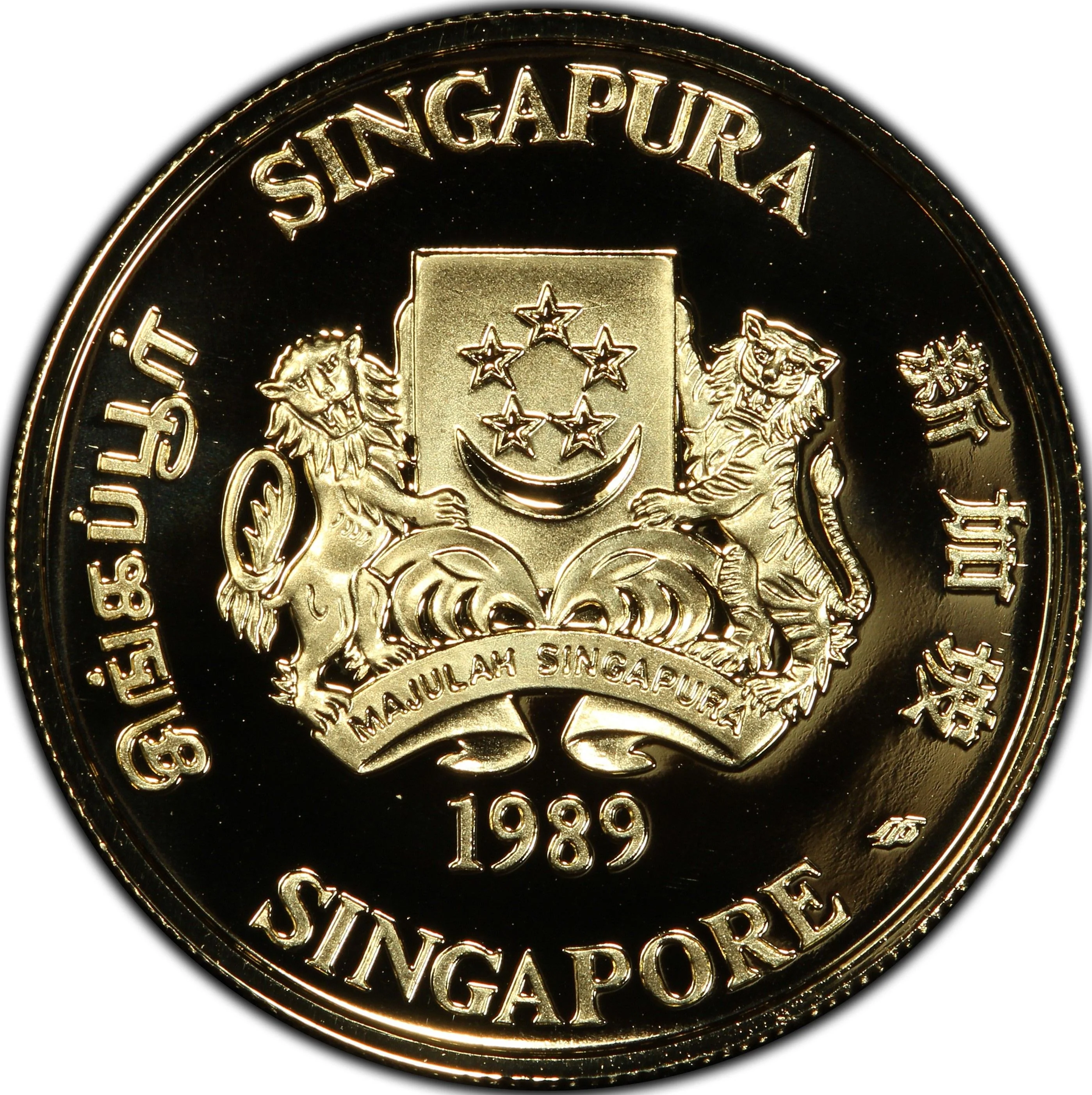 Emblem with date; 'Singapore' encircles it in English, Tamil, Chinese, and Malay.
