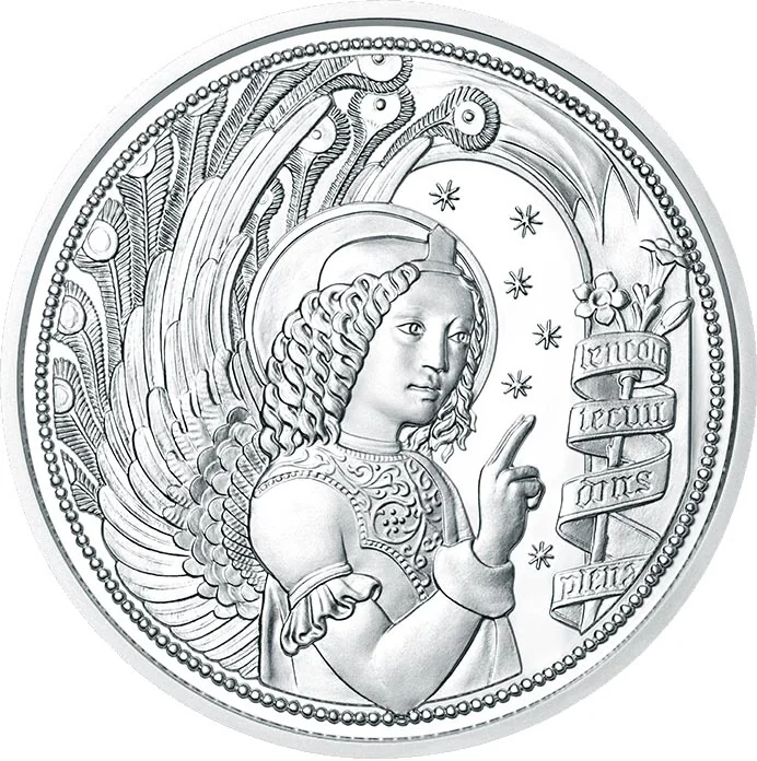 A young Angel Gabriel with curly hair, a halo, and peacock-feathered wings points skyward.
