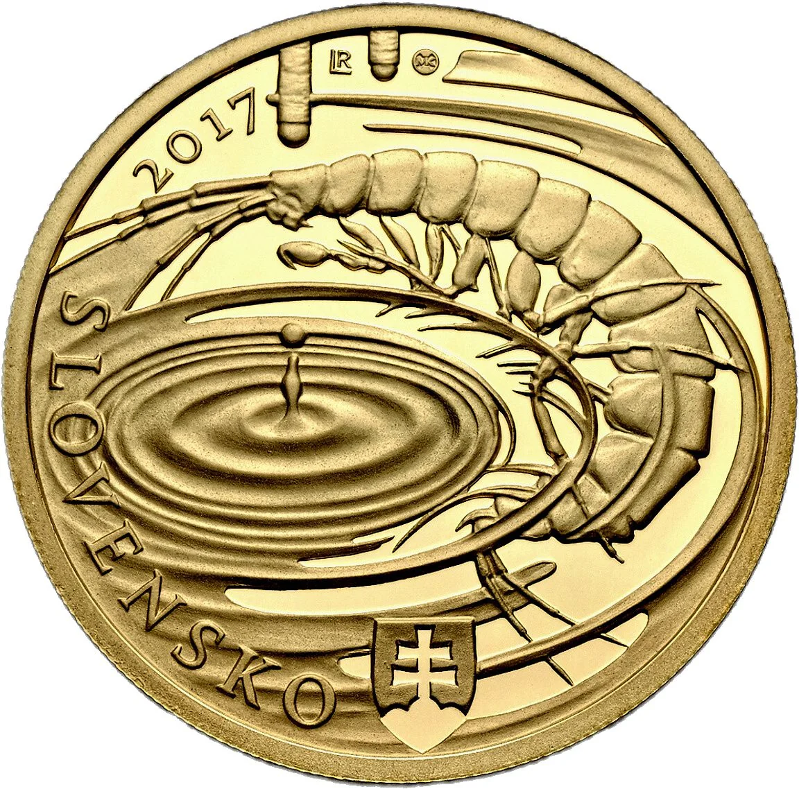 The design features a cave lake with ripples from a dripping stalactite. The cave crustacean *Niphargus aggtelekiensis* mirrors the ripples at the top right. The Slovak coat of arms is centered at the bottom, with "SLOVENSKO" to its left and the year 2017 along the edge. The designer's initials "RL" and the Kremnica Mint mark "MK" are at the top.