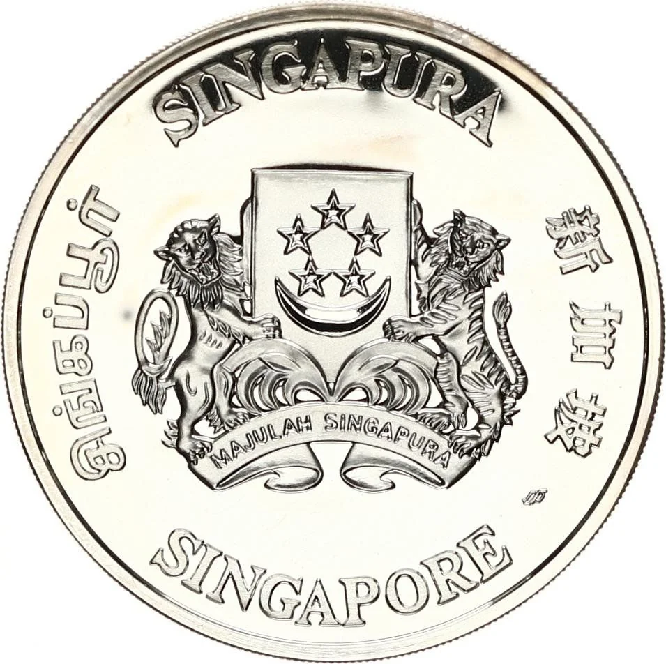 Emblem with 'Singapore' in English, Tamil, Chinese, and Malay on each side.