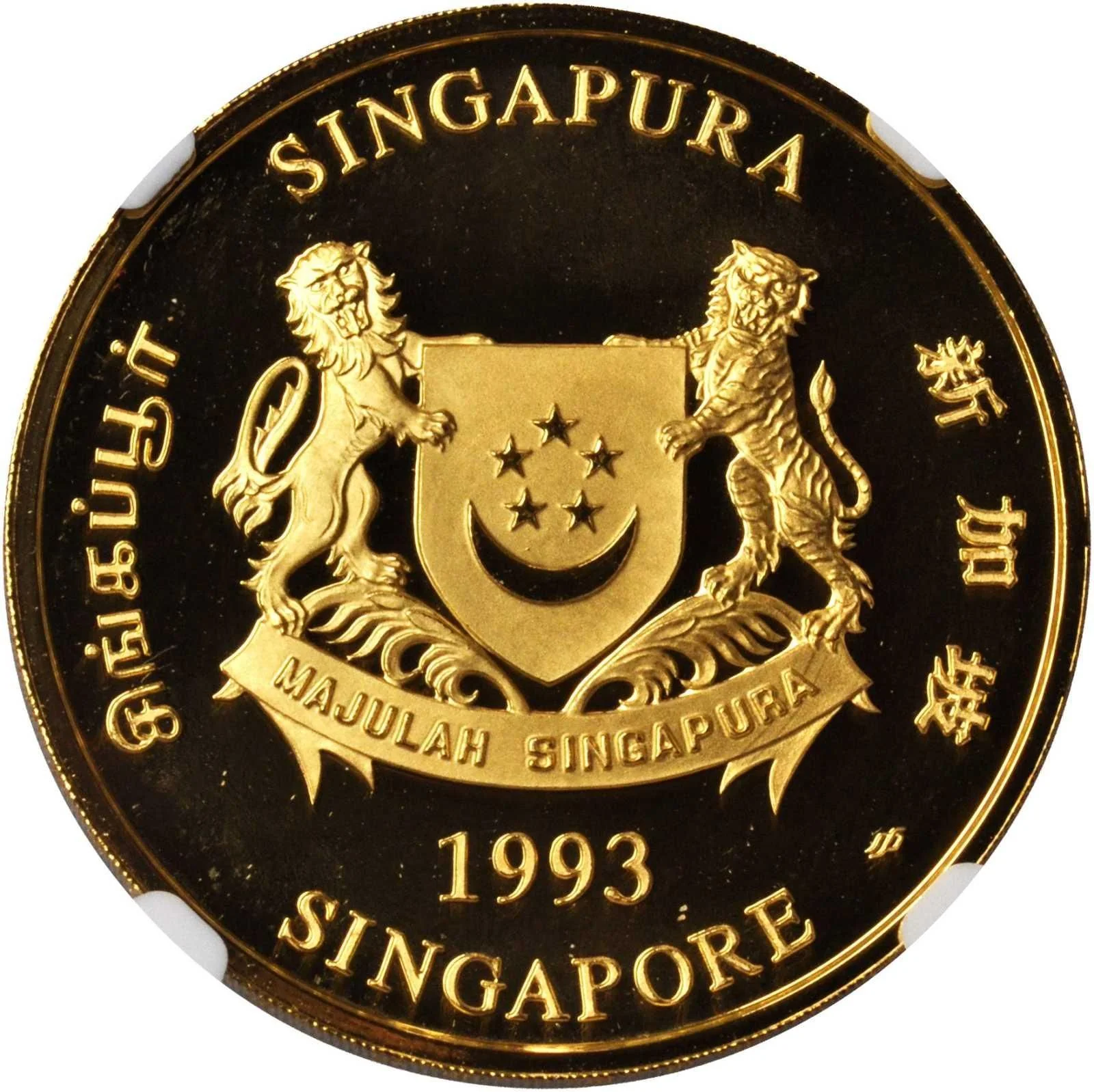 Emblem with date; 'Singapore' encircles it in English, Tamil, Chinese, and Malay.