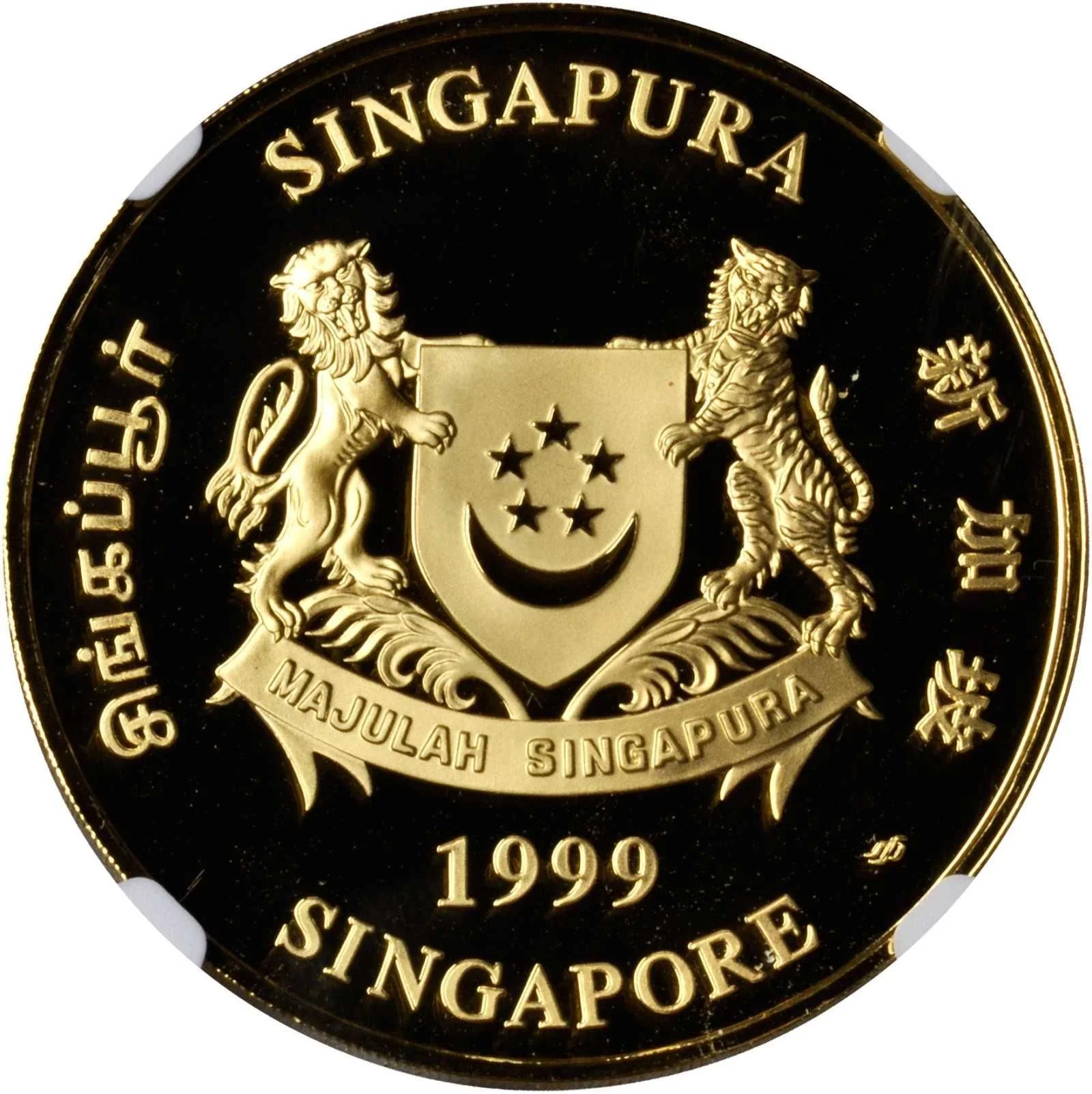 Emblem with date; 'Singapore' encircles it in English, Tamil, Chinese, and Malay.